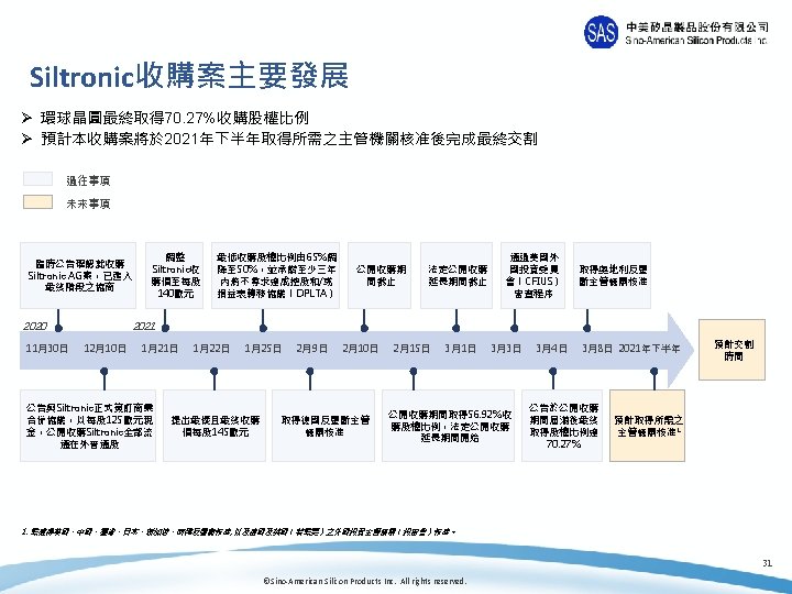 財務摘要 Ø 2020 l 無懼逆風,逐季成長 Revenue(NT$mn) Qo. Q EPS(NT$) Q 420 14, 137 0. 9% 7. 90 Q 320 14, 006 2. 2% 7. 78 Q 220 13, 701 1. 4% 7. 81 Q 120 13, 515 6. 62 l 史上第三高 ü 營收、毛利及毛利率、EBITDA、營業淨利、稅前淨利、稅後淨利、 EPS l EBITDA % & 稅後淨利率 – 史上最高! Ø 財務比例 l 充足現金*1 –NT$ 28, 165 mn (US$ 989 mn)*2 l 預付貨款 – NT$ 16, 763 mn (US$ 589 mn)*2 備註: 1. 1. 現金 = 現金&約當現金 + 受限制現金 2. FX Rate: NTD: USD = 28. 48 30 ©Sino-American Silicon Products Inc. All rights reserved.