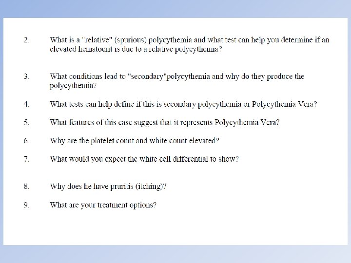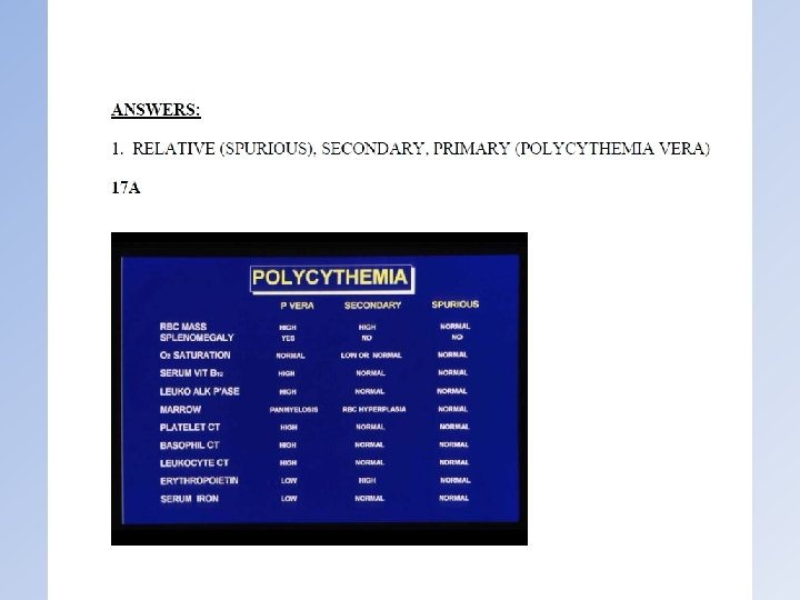 Table of Contents Case Info EXIT Case Study #13 Question 5 of 9 What features of this case suggest that it represents Polycythemia Vera? See Answer Previous Case 13 of 17 Next