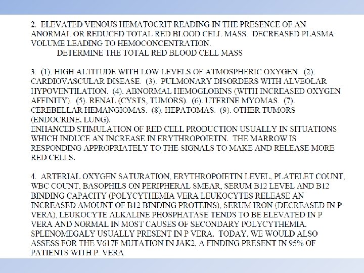 Table of Contents EXIT Case Study #13 History A 50 year old white man come to your office complaining of headaches and generalized itching. Exam On examination you notice that he had a ruddy complexion, his heart and lung exam are normal, and his spleen is palpable 3 cm below the left costal margin. Labs CBC reveals: Hemoglobin = 19 gm% Hematocrit = 68% RBC = 9 x 106/mm 3 WBC = 30, 000/mm 3 Platelet count = 700, 000/mm 3 Previous Case 13 of 17 Next