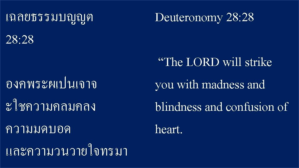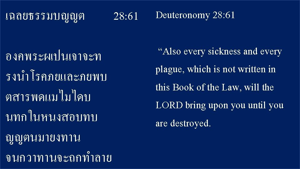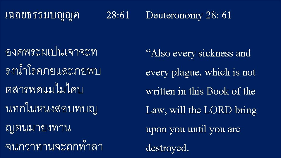 เฉลยธรรมบญญต 28: 15 แตหากทานไมเชอฟ งพระยาหเวหพระเจาของ ทานและไมใสใจปฏบ ตตามพระบญชาและกฎหม ายทงปวงซงขาพเจา กำลงแจงทานในวนน Deuteronomy 28: 15 “But it shall come to pass, if you do not obey the voice of the LORD your God, to observe carefully all His commandments and His statutes which I command you today, that all these curses will come upon you and overtake you: