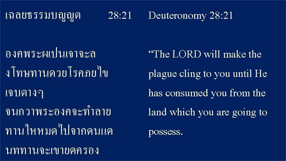 เฉลยธรรมบญญต 28: 22 องคพระผเปนเจาจะท รงบนดาลโรคภยกดกรอ นชวต ดวยความเจบไขและการอ กเสบ ดวยความรอนระอและคว ามแหงแลง Deuteronomy 28: 22 “The LORD will strike you with consumption, with fever, with inflammation, with severe burning fever, with the sword, with scorching, and with mildew; they shall pursue you until you perish.