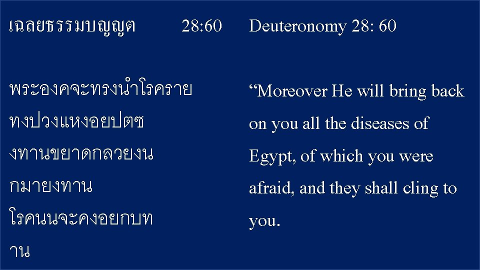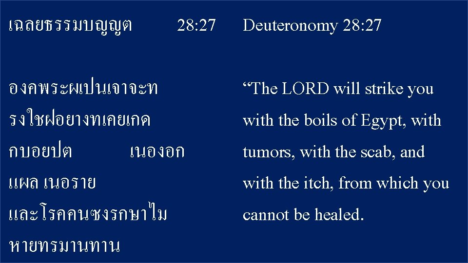 เฉลยธรรมบญญต 28: 35 องคพระผเปนเจาจ ะทรงทรมานกายของทาน ดวยฝทเจบปวดซ งรกษาไมหาย Deuteronomy 28: 35 “The LORD will strike you in the knees and on the legs with severe boils which cannot be healed, and from the sole of your foot to the top of your head.