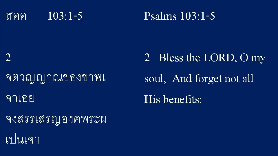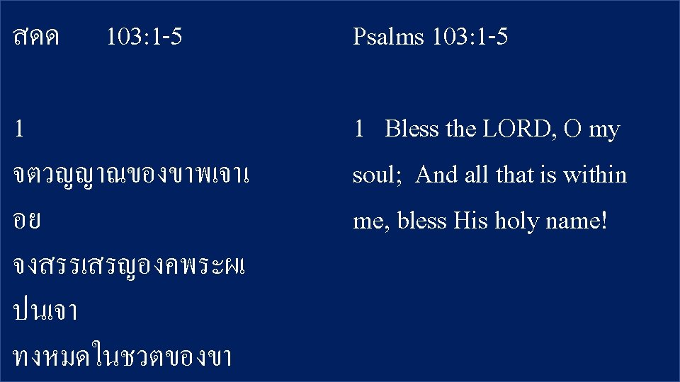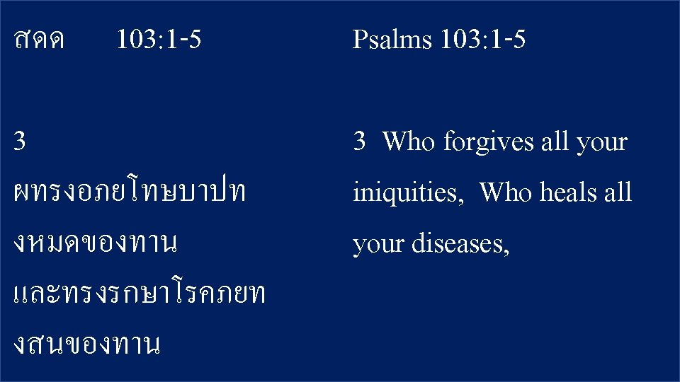 สดด 103: 1 -5 5 ผทรงใหทานอมเ อมดวยสงดๆ ตลอดชวตเพอวยฉ กรรจของทานจะกลบ Psalms 103: 1 -5 5 Who satisfies your mouth with good things, So that your youth is renewed like the eagle's.