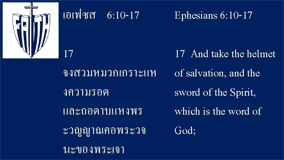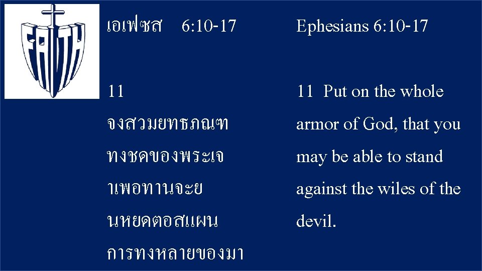 เอเฟซส 6: 10 -17 Ephesians 6: 10 -17 16 นอกจากทกลาวม าทงหมดนจงย ดโลแหงความเช อ ซงพวกทานใชด 16 above all, taking the shield of faith which you will be able to quench all the fiery darts of the wicked one.