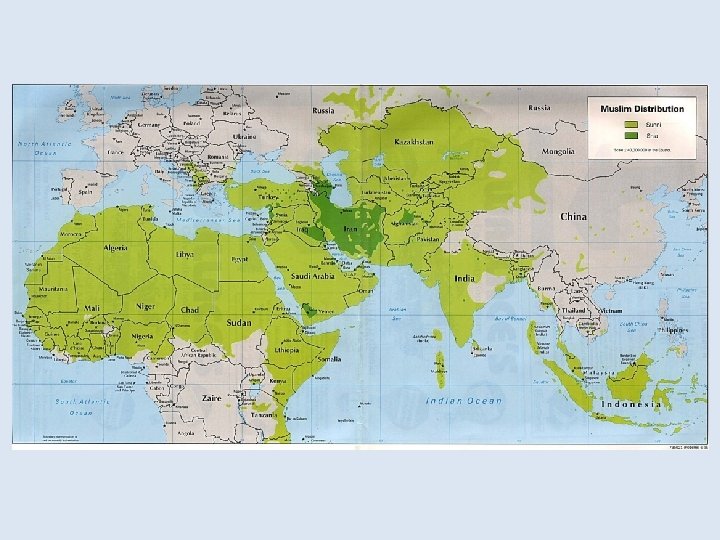 Creation of an Arab Empire • Caliph: successor to Muhammad • Muhammad had no sons, problem choosing successor • They first named Abu Bakr (his father-in-law) • Expand religion and territory • Conquered Italy, Syria, Egypt, North Africa, Persia • After Abu Bakr dies, again they have a problem choosing caliph (the next 2 are assissinated) • Ali, Muhammad’s son-in-law, becomes caliph, and he is killed after 5 years. • Islam was tolerant of Christianity and Judaism at first