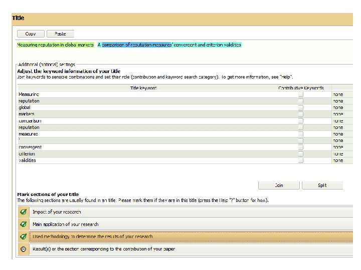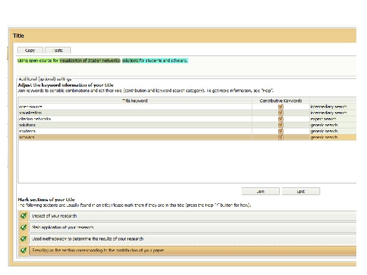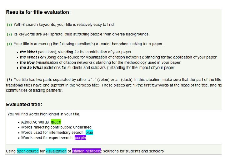 Results for title evaluation: (+) Your title is clear. (+) Your title is answering the following question(s) a reader has when looking for a paper: the What For (Visualization of citation networks); standing for the application of your paper. the So What (discussion of existing solutions and recommendations for students and scholars. ); standing for the impact of your paper. (? ) Title attractiveness is low. [hide] It lacks words such as adjectives, adverbs, or numbers, or non search keywords that are attractive for the simple reason that they belong to another field or domain. (? ) With 0 search keywords, your title is difficult to find. You should have search keywords in your title. (? ) You have chosen not to answer the following question(s): the What, standing for the contribution of your paper. the How, standing for the methodology used in your paper. [more] (!) You title has two parts separated by either a ' : ' (colon) or a - (dash). In this situation, make sure that the part of the title before the punctuation is kept short. Such titles have two places of emphasis, while traditional titles have one (upfront in the verbless title). These places are 1) the first few words at the head of the title, and right after the dividing punctuation, as in "Web Services : Enabling technology for virtual communities of trading partners". Evaluated title: No highlightings were needed to do to this section.
