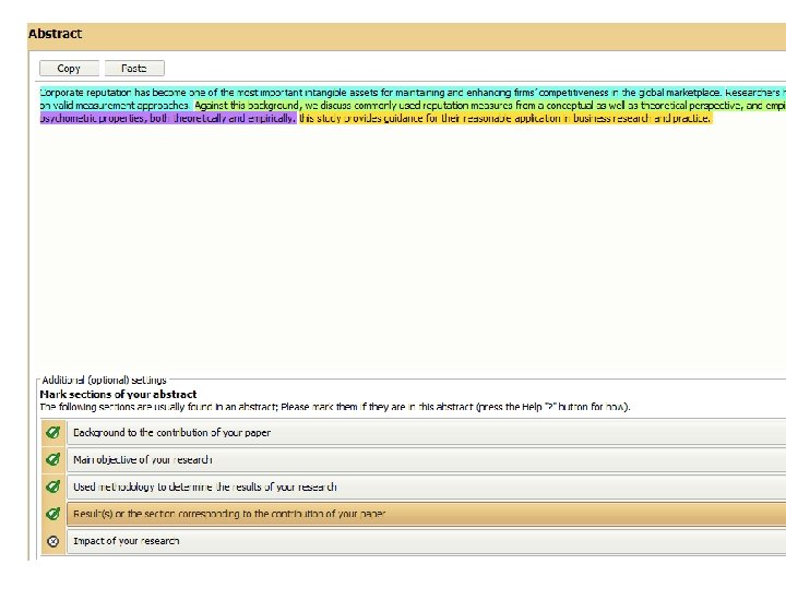 Results for abstract evaluation (+) You have made a good choice when deciding to use the present and present perfect tenses in your abstract. (? ) You have words in your title that are not used in your abstract. [more] (? ) Your abstract is incomplete. [more] (? ) It is more important to show the reader how important your contribution is in terms of impact instead of how important the problem is. Evaluated abstract: No highlightings were needed to do to this section.