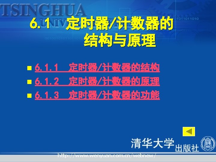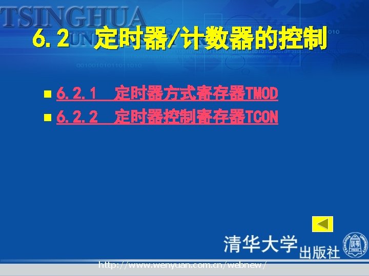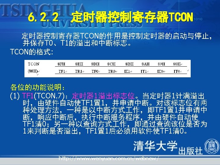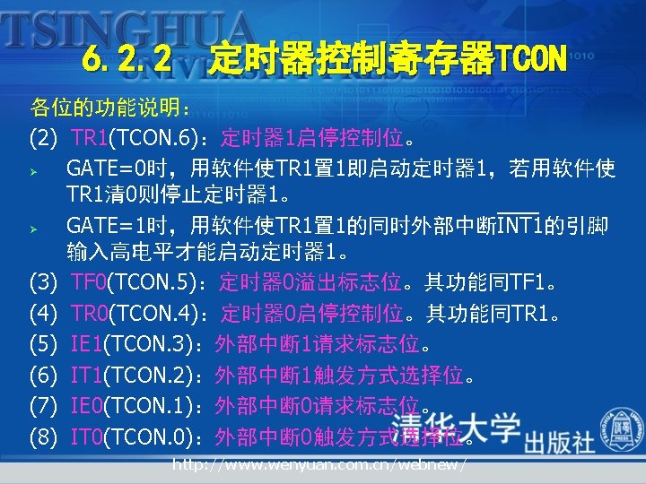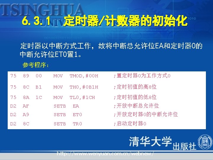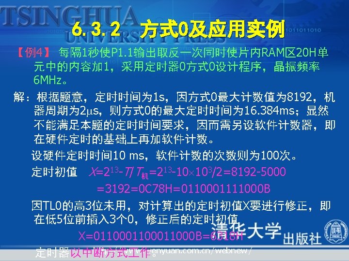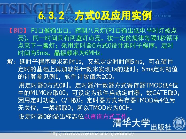 参考程序: 6. 3. 2 方式 0及应用实例 地址 机器码 程序 ORG 0000 H 02 00 50 LJMP MAIN: 注释 0000 H MAIN ORG 0050 H SETB P 1. 0 0050 H D 2 90 0052 H 75 89 00 MOV TMOD, #00 H ; 置定时器 1为 作方式 0 0055 H 75 8 D F 1 MOV TH 1, #0 F 0 H ; 置 500 s定时初值 0058 H 75 8 B 0 C MOV TL 1, #0 CH 005 BH D 2 8 E 005 DH 10 8 F 0060 H 80 FB 0062 H 75 8 D F 1 0065 H 75 8 B 0 C 0068 H B 2 006 AH 80 SETB 02 LP 1: JBC SJMP LP 2: TR 1 TF 1, LP 2 LP 1 ; 置P 1. 0初始状态 ; 启动定时器 1 ; 查询计数溢出 ; 未到 500 s继续计数 MOV TH 1, #0 F 0 H ; 重新置 500 s定时初值 MOV TL 1, #0 CH 90 CPL P 1. 0 ; 输出取反 E 4 SJMP LP 1 ; 重复循环 END http: //www. wenyuan. com. cn/webnew/