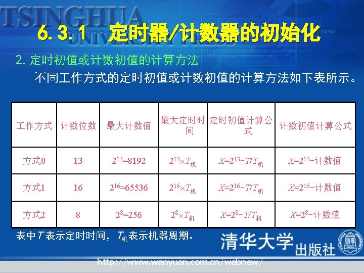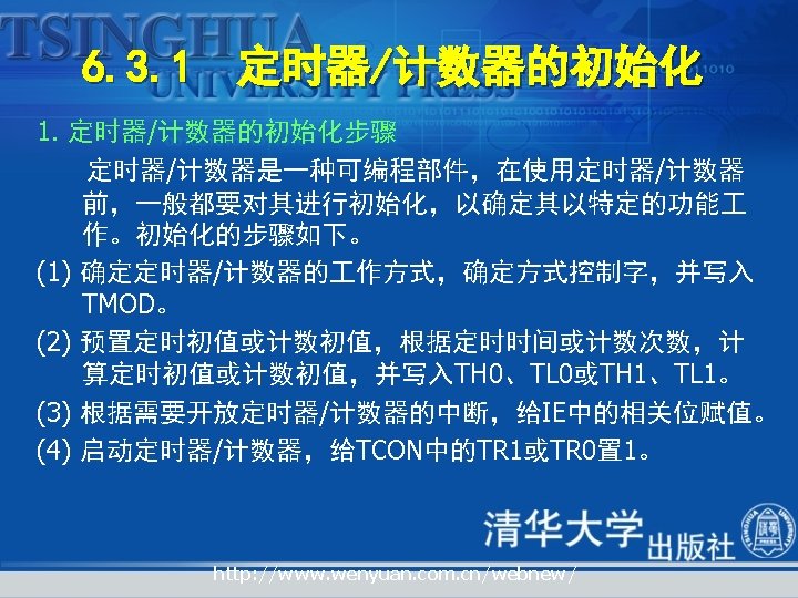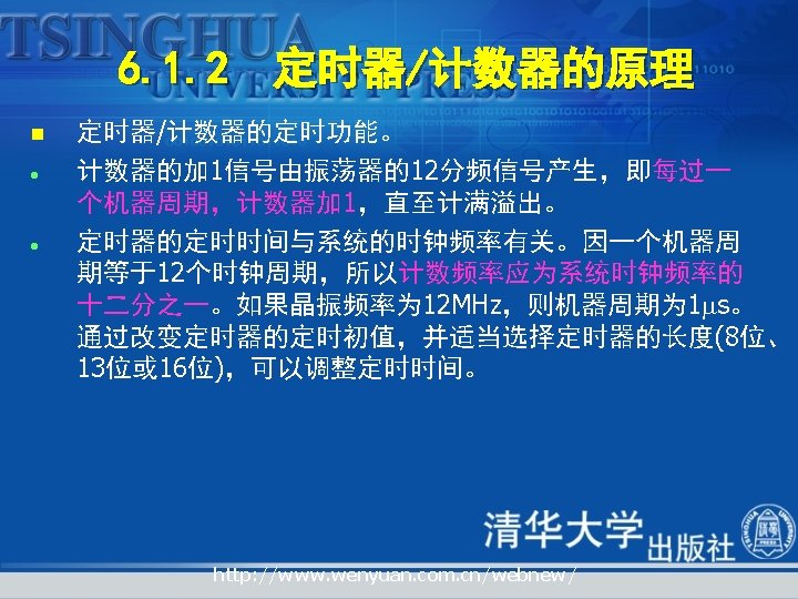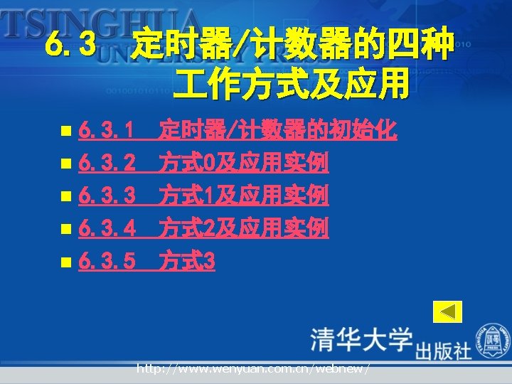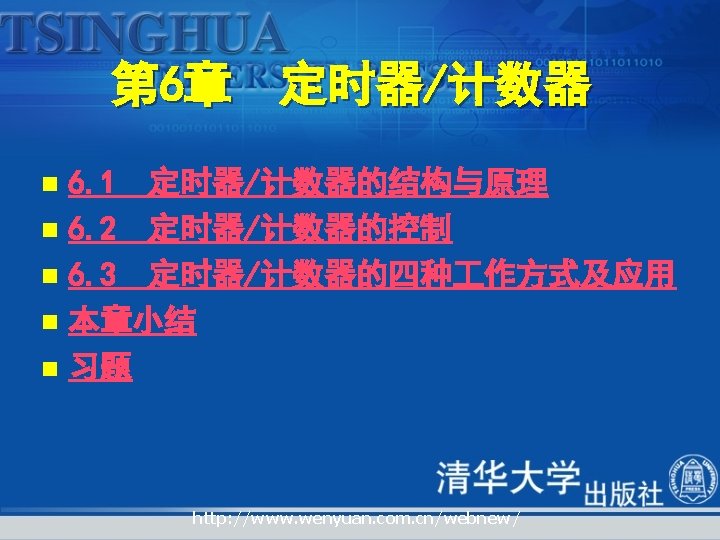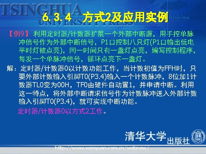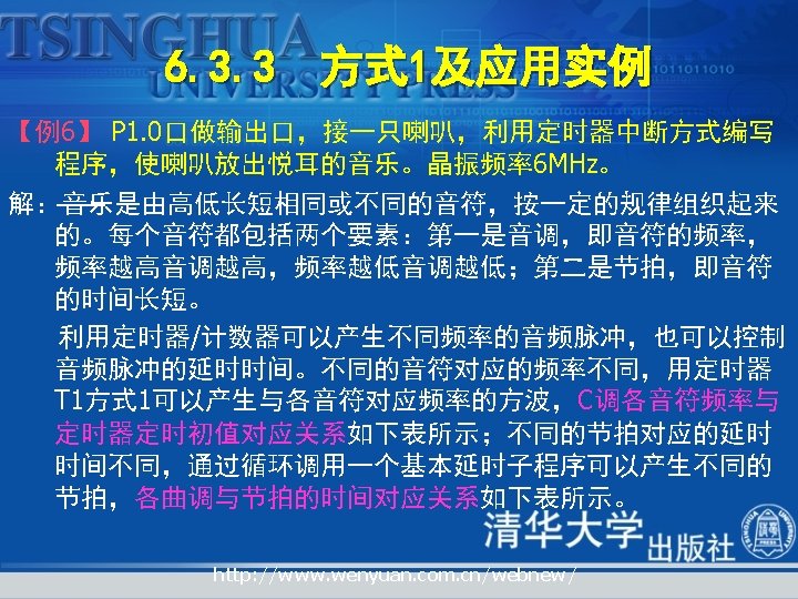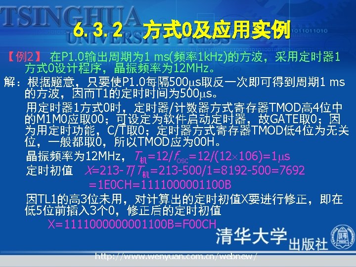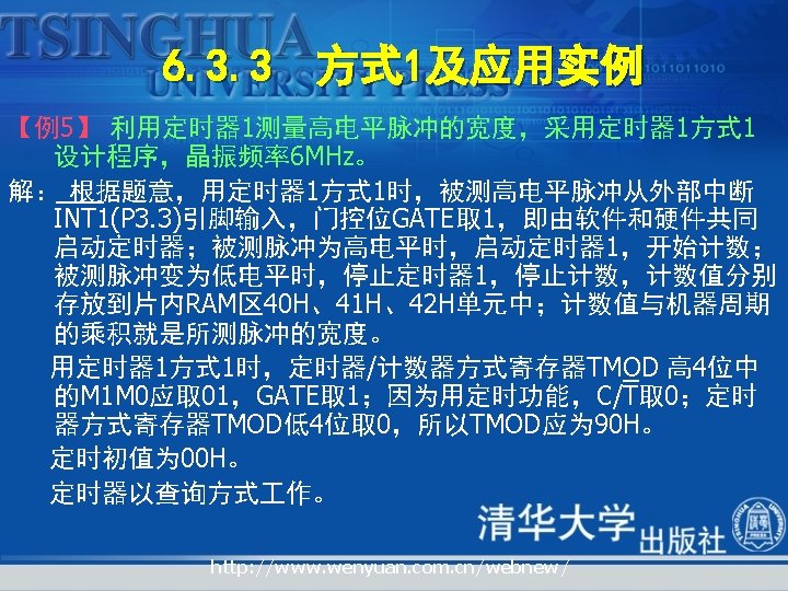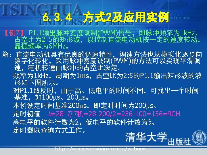 定时器 0中断服务程序: ORG 0050 H 6. 3. 4 方式 2及应用实例 0050 H DA 0 B 0052 H B 2 91 CPL P 1. 1 ; P 1. 1取反 0054 H 30 91 04 JNB P 1. 1, L 1 ; 判断P 1. 1电平高低 7 A 02 MOV R 2, #02 H ; 若P 1. 1=1, 给R 2赋高电平计数 值 80 02 SJMP 0057 H 0059 H 005 BH 005 DH 7 A 04 32 INT 0:DJNZ L 1:MOV R 2, EXIT R 2, #03 H ; 若P 1. 1=0, 给R 2赋低电平计数 值 EXIT:RETI END 矩形波的波形图 http: //www. wenyuan. com. cn/webnew/