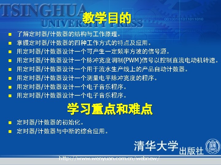 参考程序: 006 AH 10 8 F 05 006 DH 20 B 3 FA 0070 H 80 04 0072 H 05 40 0074 H 80 F 4 0076 H C 2 8 E 0078 H 85 8 D 41 007 BH 85 8 B 007 EH 12 01 0081 H 80 DD LP 1: JBC JB TF 1, LP 2 P 3. 3, LP 1 SJMP LP 2: INC LP 3 40 H SJMP LP 3: CLR ; 低电平到, 停止定时器 1 ; 存储区最高位加 1 LP 1 TR 1 ; 停止定时器 1 MOV 41 H, TH 1 ; 计数值高 8位放入存储区 42 MOV 42 H, TL 1 ; 计数值低8位放入存储区 00 LCALL SJMP ORG DIS: (略) DIS MAIN ; 调用显示子程序 ; 重复循环 0100 H ; 显示子程序 END http: //www. wenyuan. com. cn/webnew/