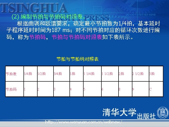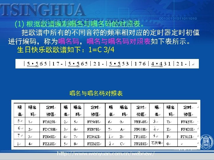 参考程序:唱名码表 ORG 0250 H TABLE 2: DW FD 82 H, FDC 8 H, FE 06 H 0256 H DW FE 22 H, FE 56 H, FE 85 H 025 CH DW FE 9 AH, FEB 2 H, FEE 4 H 0262 H DW FF 03 H, FF 11 H, FF 2 BH 0268 H DW FF 42 H, FF 4 DH, FF 61 H END ; 唱名码表 ; 程序结束 http: //www. wenyuan. com. cn/webnew/