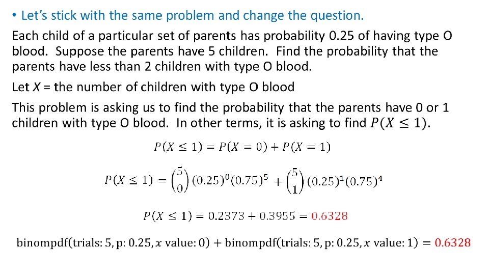 Let’s revisit: Each child of a particular set of parents has probability 0. 25 of having type O blood. Suppose the parents have 5 children. Find the probability that the parents have less than 2 children with type O blood. When we did this before, we got 0. 6328. Each child of a particular set of parents has probability 0. 25 of having type O blood. Suppose the parents have 5 children. Find the probability that the parents have more than 3 children with type O blood. We got 0. 0156 before.