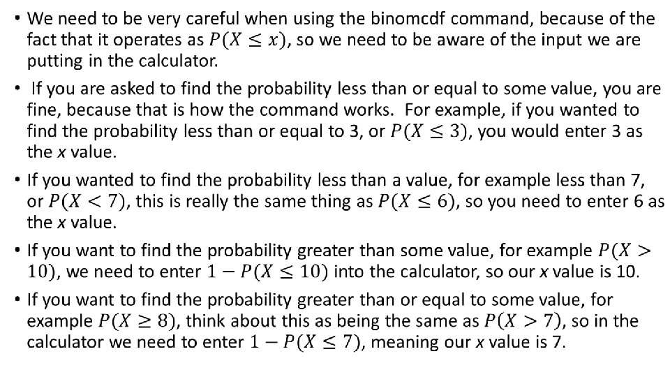 The binompdf function calculates these probabilities for us. To locate, go to 2 nd, DISTR, A: binompdf(n, p, k) computes P(X = k) n is your number of trials, p is the probability of success, and k is the x value In the previous example, we saw that the probability of rolling exactly three 6’s was 0. 015. On the calculator, we would enter: binompdf(trials: 4, p: 1/6, x value: 3) We would get 0. 015.