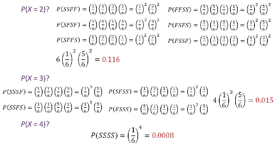 • Let’s go back to the die example and look at how we can use this formula when X = 3. Reminder, this probability was 0. 015.