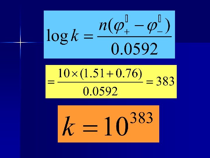 Example Estimate the extent of the following redox reaction at 25℃. Z n + Cu 2+ Z n 2+ + Cu Solution: log k =16. 9× 2 ×(0. 337+0. 76)=37. 18 K = 1. 5 × 10 37 The reaction is very completely from left to right.
