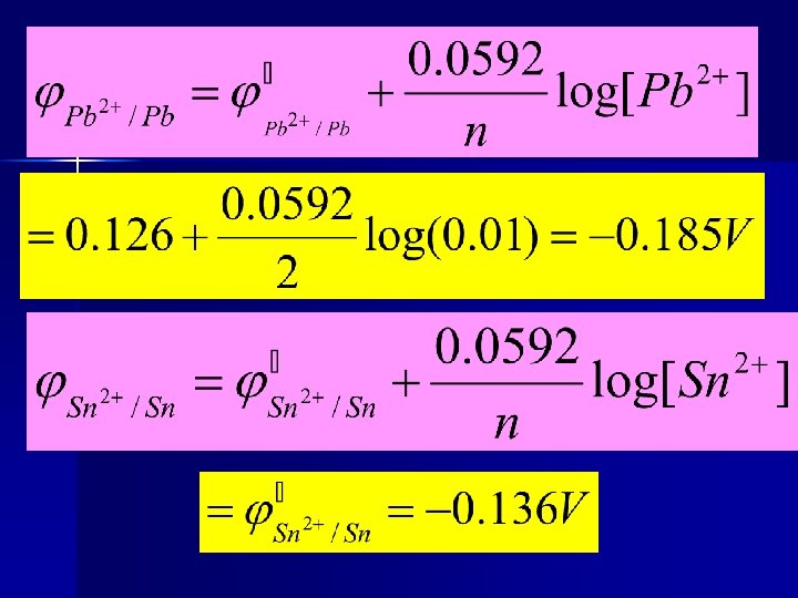 Example 6 -2 Calculate φ for the half-reaction Sn 4+ + 2 e- Sn 2+ At 25 ℃ if the concentration of Sn 2+ is 0. 40 mol/L and the concentration of Sn 4+ is 0. 10 mol/L. Solution: