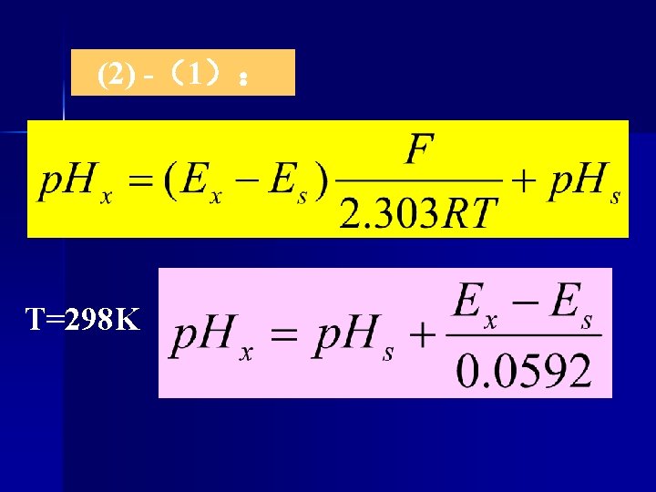 • Measurement p. H value of a solution by hydrogen electrode Cell notation (-) Pt|H 2(1 atm) | H+ (p. H x) | | SCE (+) 25℃ Φ+= φ SCE = + 0. 2412 V E= Φ+-Φ-= 0. 2412+0. 0592 p. H