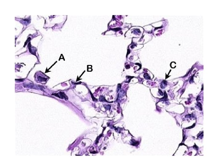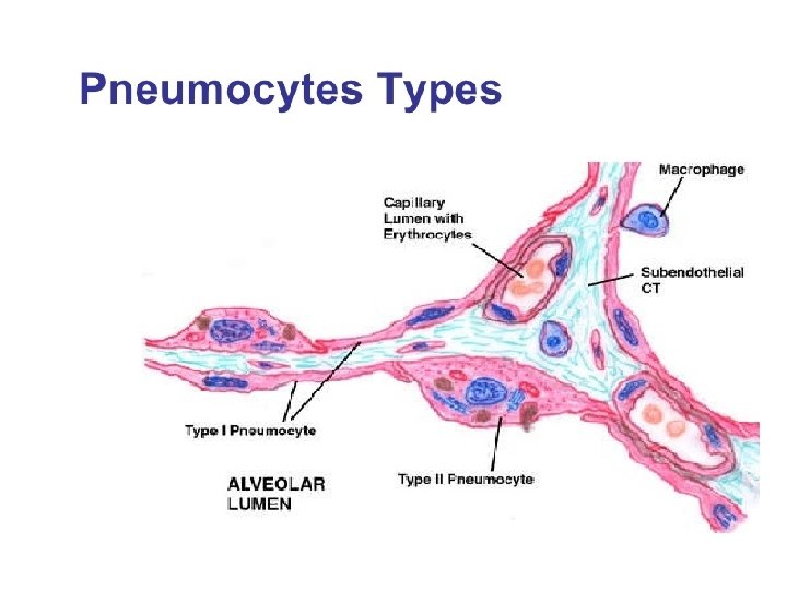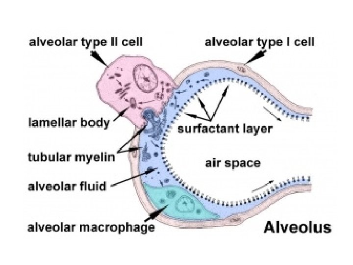 • 6. 4 U 2: Type I pneumocytes are extremely thin alveolar cells that are adapted to carry out gas exchange. • 6. 4 U 3: Type II pneumocytes secrete a solution containing surfactant that creates moist surface inside the alveoli to prevent the sides of the alveolus adhering to each other by reducing surface tension.