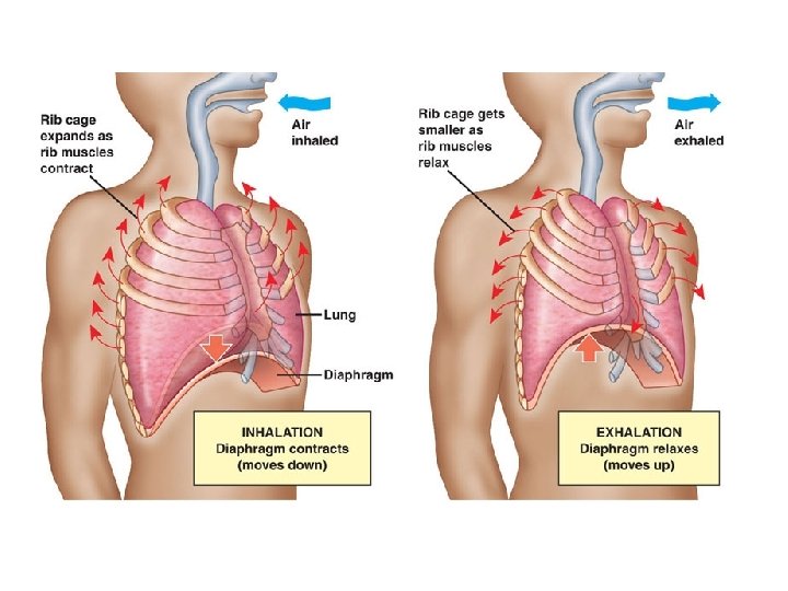 • Exhalation: Blowing air out! • The external intercostal muscles and diaphragm relax. • this moves the ribs down and in and the diaphragm up decreasing the volume of the thoracic cavity around the lungs. • This decreases the volume and increases pressure inside the lungs. • Gas moves from high pressure to low pressure, and moves out of the lungs. • The internal intercostal muscles may also contract to force air out when coughing for example.