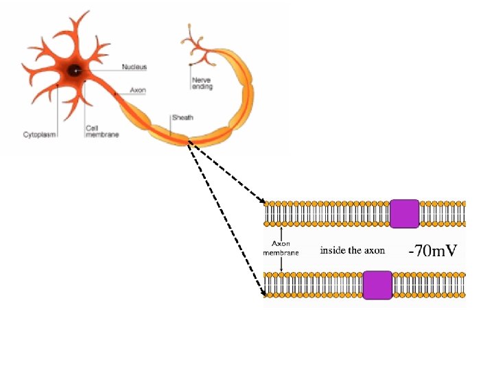 Na+ channel is closed An electrical gradient pulls K+ back into the axon will diffuse out of the axon making the outside positive and the inside negative This creates concentration gradients for Na+ and K+ K+ K+ Na+/K+ pumps 3 x Na+ out and 2 x K+ in to the axon 2 x K+ K+ channel 3 x Na+ The chemical and electrical gradients will balance at -70 m. V K+ channel -70 m. V