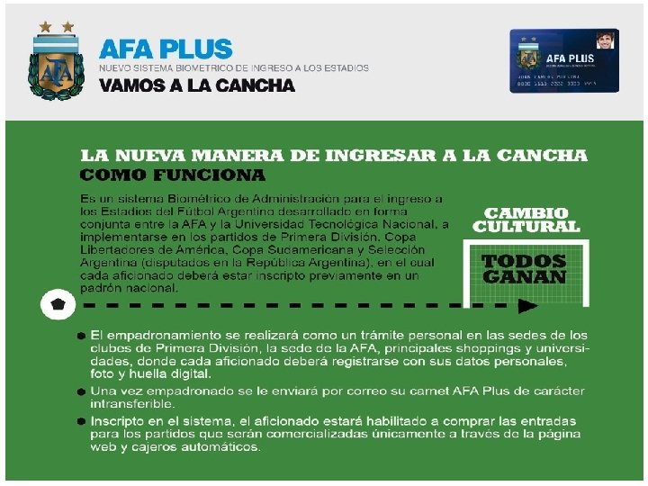 6. Acceso: El acceso al estadio, mediante lecturas de huella digital y tarjeta magnética, se verificará la titularidad del portador de la misma. 5. Lector de Tarjeta: Mediante un primer control policial se verificará la identidad, la entrada y que la puerta de acceso sea la correcta. 4. Datos: Al momento de la venta se le informará al aficionado la fecha del evento elegido, hora, tribuna, ubicación y puerta de acceso. 1. Empadronamiento: Toda persona que quiera asistir a un partido de fútbol de Primera División debe registrarse en el Padrón de Aficionados. 2. Carnet Intransferible: Al momento de empadronarse se toman los datos personales, huellas digitales y una foto de cada aficionado; se imprime un carnet intransferible que funciona como tarjeta magnética. 3. Entradas: El aficionado podrá comprar su entrada virtual por la página web y cajeros automáticos. Bastará con número de documento del aficionado para comenzar la operatoria de compra.