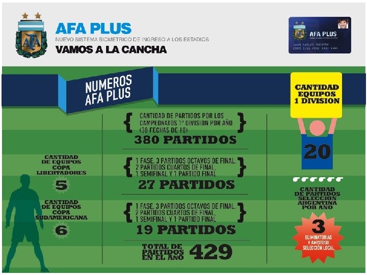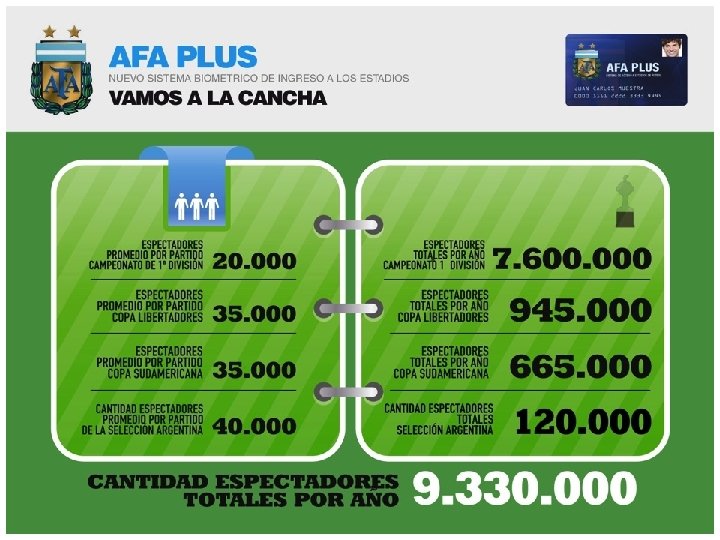 Estadios y Centros de Acreditación Cantidad de Estadios de 1° División: Cantidad de Centros de Empadronamiento 20 40 (en una 1º etapa) Cantidad Total de Puertas de Acceso: Cantidad anual de Tickets de venta estimados: 600 Cantidad Total Puertas Salida: 500 4. 500. 000 Cantidad de Cajeros automáticos en Argentina: 11. 488 Cantidad de Carnets Proyectados 1° año: Cantidad de Carnets Proyectados 2° año Cantidad de Carnets Proyectados 3°año Cantidad estimada de visitas anuales a la página web: 1. 500. 000 3. 500. 000 : 5. 500. 000 11. 000 (800 M socios, más las altas, más aficionados no socios)