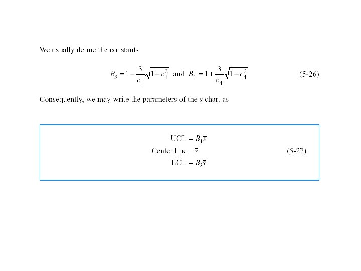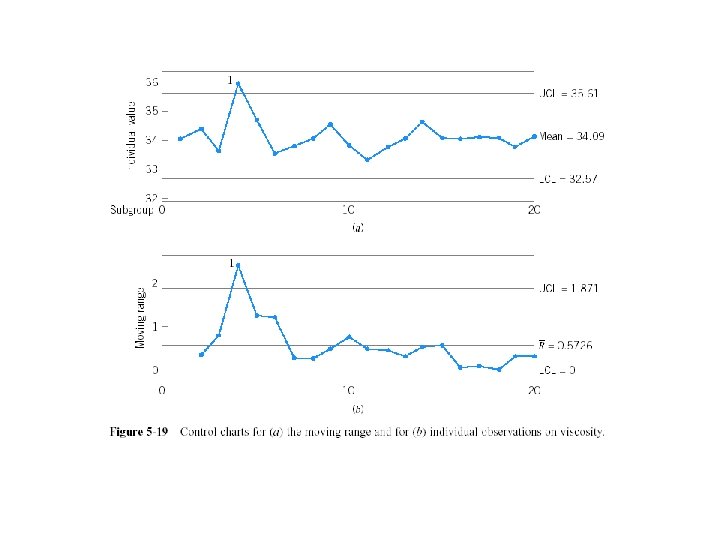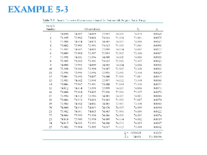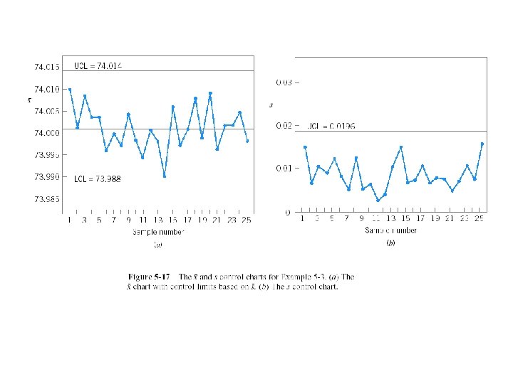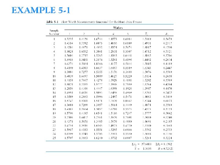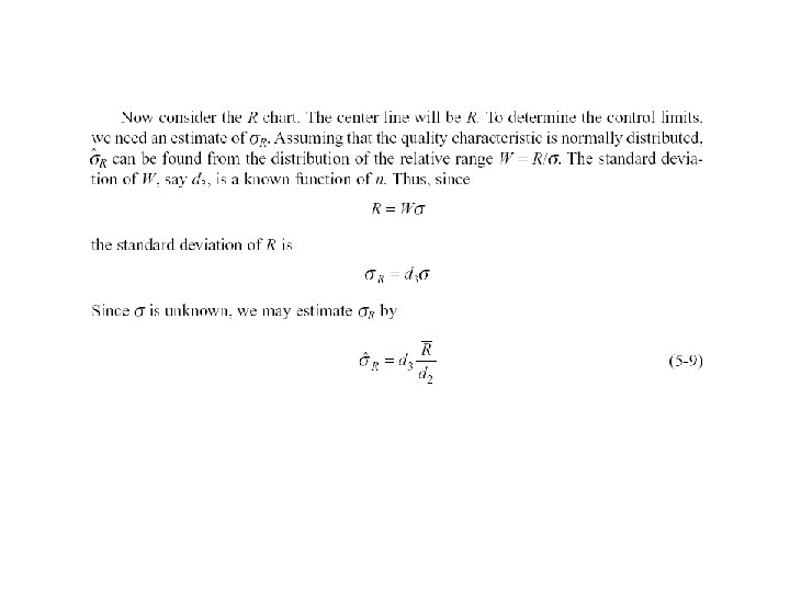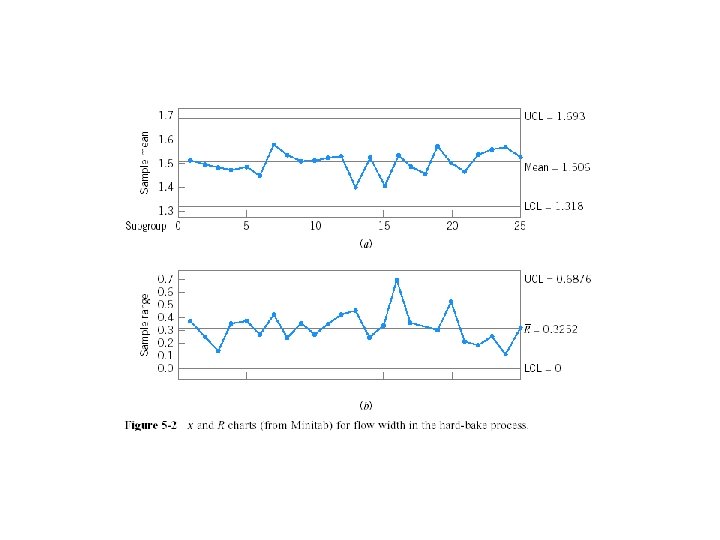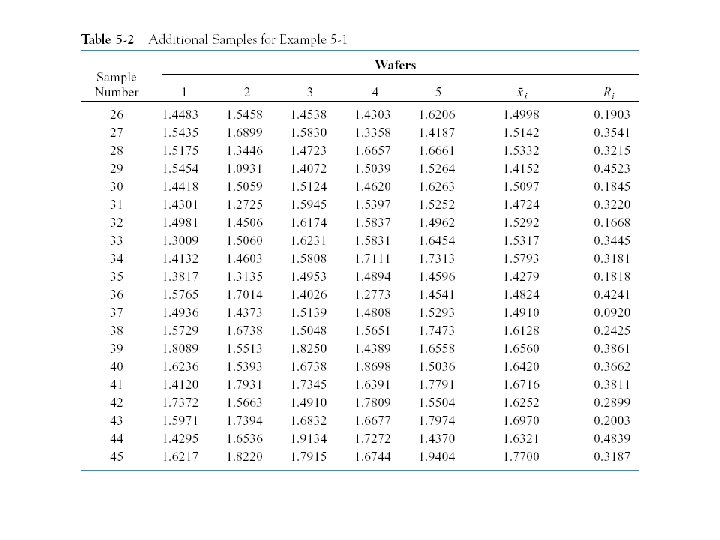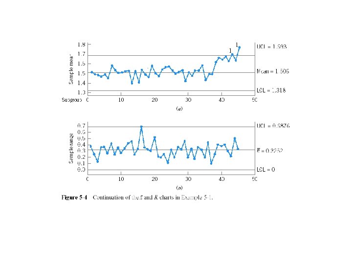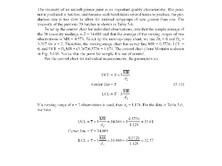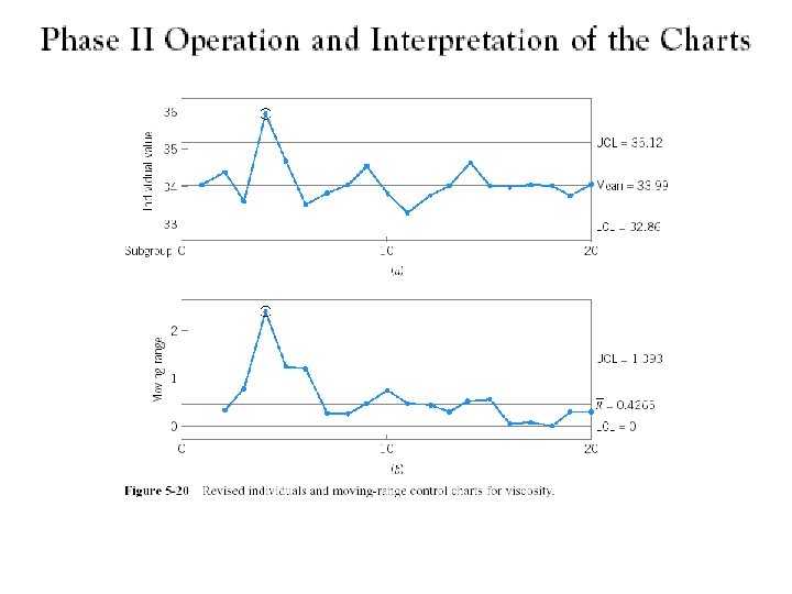 Phase I Application of • • and R Charts Eqns 5 -4 and 5 -5 are trial control limits To determine if the process is in control when the initial samples were taken, plot the values of mean and R from each sample on the chart and analyze. If all the points are within the limit and there is no systematic pattern, then the trial control limits can be used in the future. – Determined from m initial samples • – Typically 20 -25 subgroups of size n between 3 and 5 Any out-of-control points should be examined for assignable causes • • If assignable causes are found, discard points from calculations and revise the trial control limits using the remaining points. Continue examination until all points plot in control Adopt resulting trial control limits for use If no assignable cause is found, there are two options 1. 2. – Eliminate point as if an assignable cause were found and revise limits Retain point and consider limits appropriate for control If there are many out-of-control points they should be examined for patterns that may identify underlying process problems