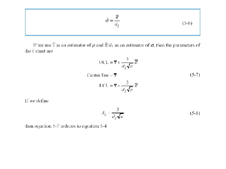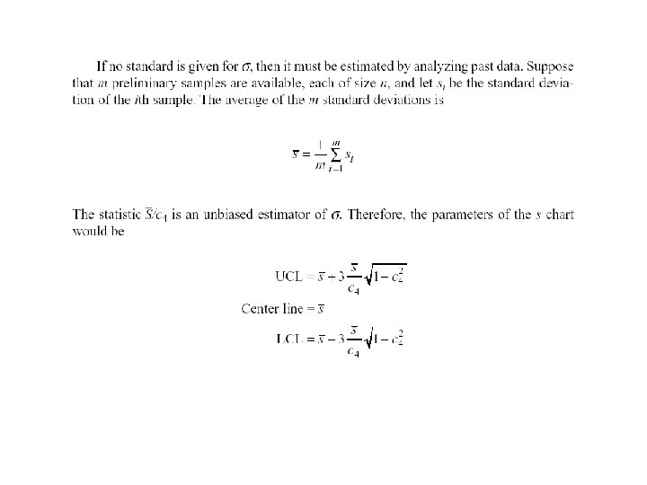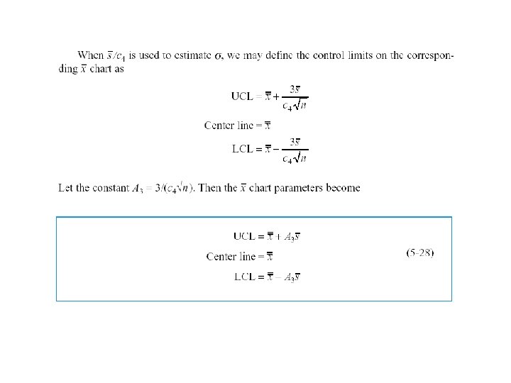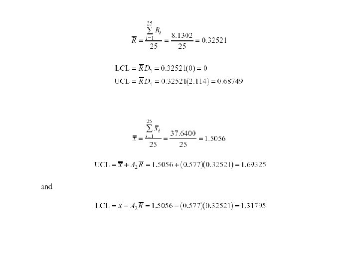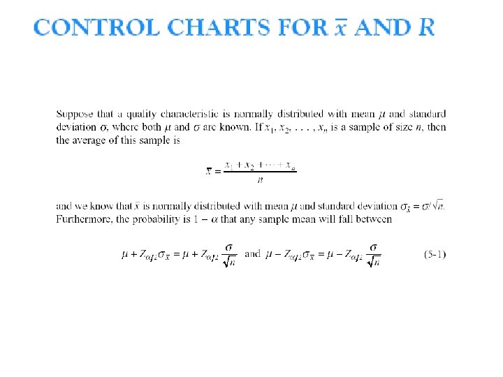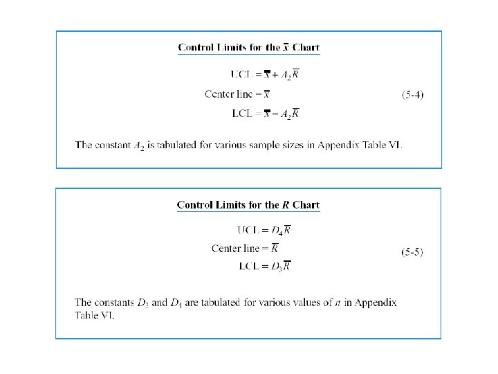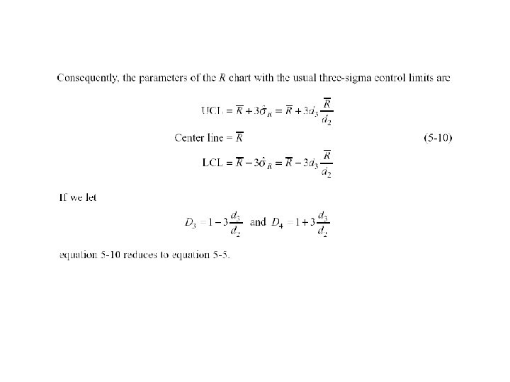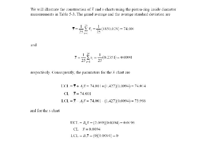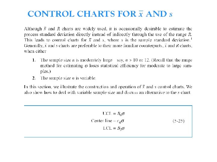 Revision of Control Limits and Center Lines • Effective use of control charts requires periodic review and revision of control limits and center lines • Sometimes users replace the center line on the chart with a target value • When R chart is out of control, out-of-control points are often eliminated to recompute a revised value of which is used to determine new limits and center line on R chart and new limits on chart