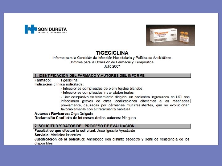Conveniencia l Seguimiento uso Uso general hospital Datos indican utilización puede mejorar Infección en diferentes localizaciones ITU y tigeciclina Daptomicina Neumonía