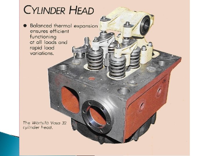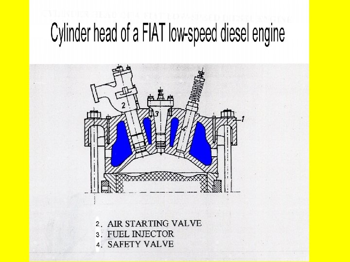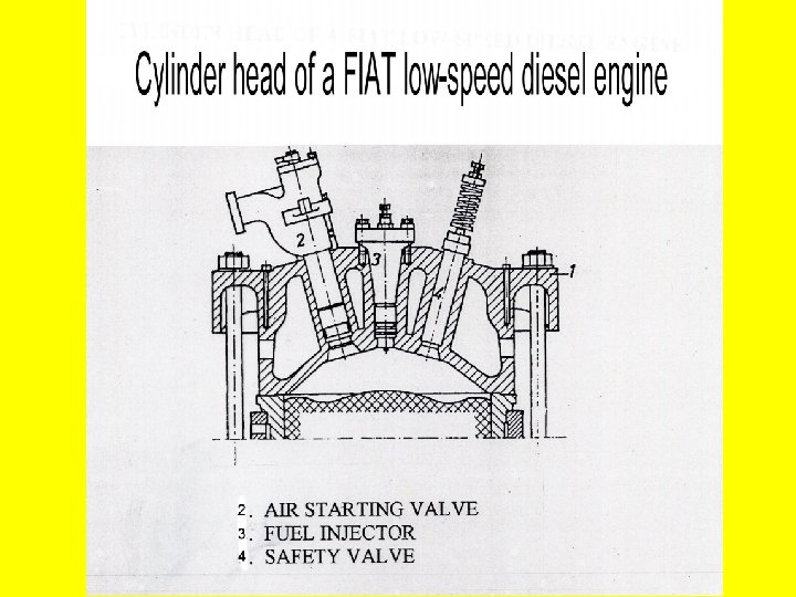 1. DEFINITION Ø Cylinder head is a casting that covers the top of a cylinder. 2. FUNCTION Ø To close toghtly / seal off the top of cylinders. Ø To form the combustion chamber, together with the piston crown or in some cases with the liner itself. Ø To carry the injector and the valves. 3. VALVES All internal combustion engines ( 2 or 4 -stroke ) have: Ø an air starting valve which admits compressed air into the cylinder for starting purposes; Ø a safety or relief valve is a spring loaded valve set to a safe limit which releases excessive pressure;