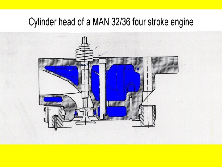 Ø 4 -stroke engines have inlet / intake and exhaust valves. 4. STRESSES High pressure and temperature due to combustion. 5. REQUIREMENTS Ø Strong, sturdy construction / manufacture. Ø Carefully cooled 6. COOLING Is executed by F. W. circulation, as excessive temperature may give rise to damage by cracking. 7. MATERIAL