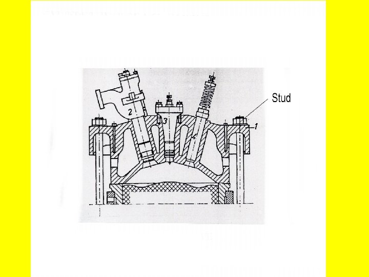 Ø 4 -stroke engines have inlet / intake and exhaust valves. 4. STRESSES High pressure and temperature due to combustion. 5. REQUIREMENTS Ø Strong, sturdy construction / manufacture. Ø Carefully cooled 6. COOLING Is executed by F. W. circulation, as excessive temperature may give rise to damage by cracking. 7. MATERIAL Cast or forged steel