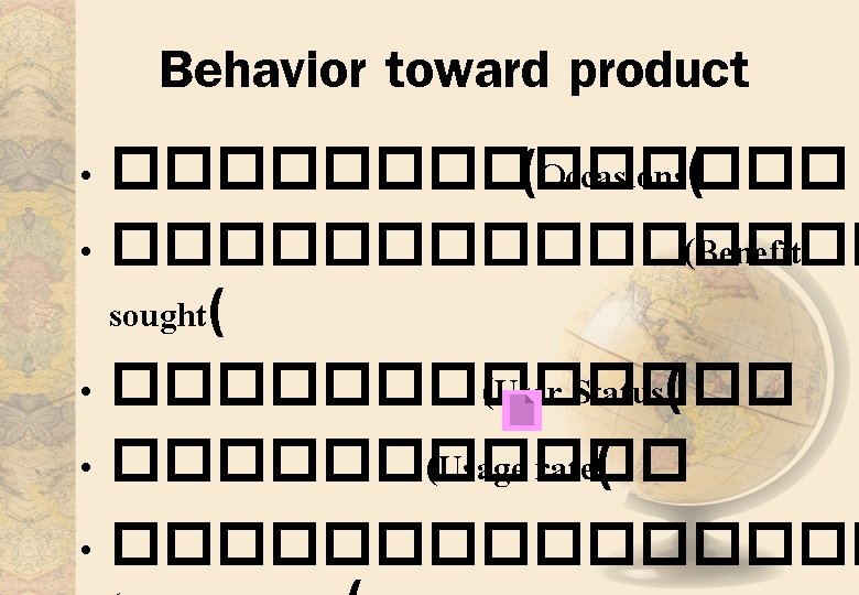 6 Develop marketing mix for each target segment Slides: 26 Download presentation . 6 Develop marketing mix for each target segment. 5 Develop positioning for each target segments. . 4 Select the target segment(s. (. 3 Develop measures of segment attractiveness. . 2 Develop profiles of resulting segments. . 1 Identify bases for segmenting the market Market positioning Market targeting Market segmentation Source : Gary Armstrong, Philip Kotler, 2000 Market Segmentation ����� � Mass Marketing Segment Marketing Niche Marketing Micromarketing Levels of marketing segmentation Source : Gary Armstrong, Philip Kotler, 2000 Market Segmentation • Bases for Segmenting Consumer Markets • Segmenting Business Markets • Segmenting International Markets Segmentation bases for consumer markets Geographic segmentation Demographic segmentation Psychographic segmentation Behavior toward product Geographic segmentation Demographic segmentation • �������� (Age and Life. Cycle Stage( • ��� (Gender( • ������ (Income( Psychographic segmentation • Social class • Lifestyle • Personality characteristics Segmenting Business Markets • • Demographic (industry, company size, location( Operating characteristics Situational factors Personal characteristics Segmenting International Markets • �������� �(Geographic location( • �������� (Economic factors( • �������� (Political and legal factors( ������� • �������� (Undifferentiated Marketing( • ������� (Differentiated Marketing( • �������� (Concentrated Marketing(