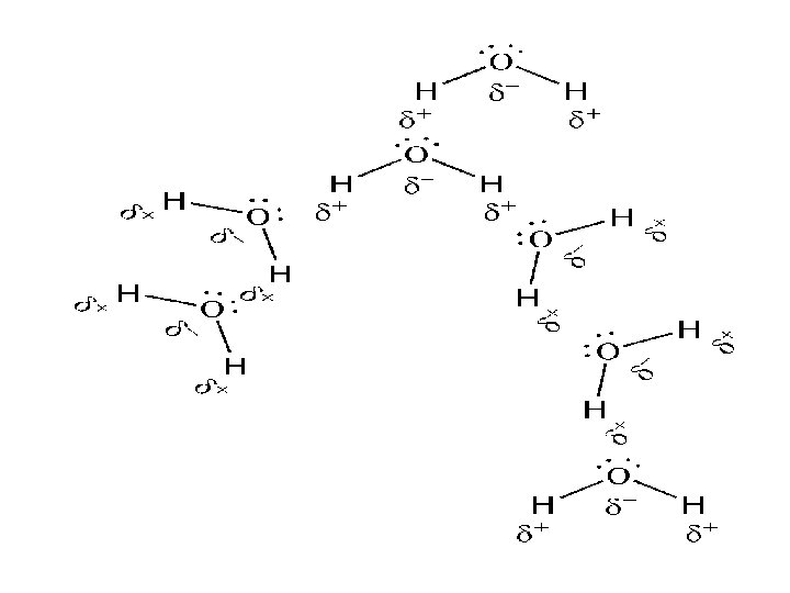 Hydrogen Bonding Ø Occurs when H is involved in a strongly polar bond with O, N or F. Ø The H nucleus (just a proton) is attracted to the lone pairs of these highly electronegative atoms. Ø The result is a network of strong intermolecular interactions between H atoms and available lone pairs. Ø Occurs in H 2 O, NH 3 and HF. • The primary reason H 2 O doesn’t behave as almost all other substances in the known universe. • H 2 O expands when it freezes everything else contracts