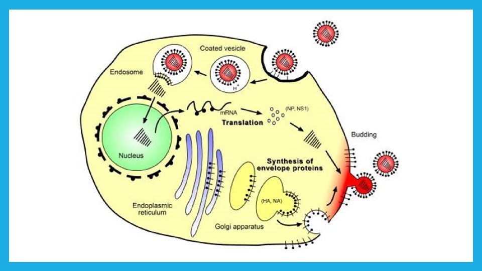 UMNOŽAVANJE VIRUSA - virusi se umnožavaju u živoj stanici, od koje uzimaju sve osim enzima transkriptaze - virusne komponente se sintetiziraju u različitim dijelovima stanice u različito vrijeme - mogu se replicirati u jezgri ili citoplazmi; svi DNA virusi se repliciraju u jezgri, osim poksvirusa, dok se svi RNA virusi repliciraju u citoplazmi, osim ortomiksovirusa