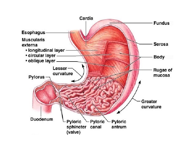 Magi • • Þykkur og vöðvaríkur. Magakirtlar mynda magasafa sem inniheldur: – Slím - Verndar innra borð magans – Saltsýru (HCl) - Drepur flesta gerla og virkjar pepsín – Pepsín - Brýtur niður prótein í fjölpeptíð. • • • Hnoðar og blandar fæðuna með öflugum bylgjuhreyfingum. Hefur þrjú lög af sléttum vöðvum Fæðan er 3 -4 klst í maganum. Magaportvöðvinn, sem er annar hringvöðvi, hleypir ákveðnum skammti af fæðumauki niður í skeifugörnina. Frásog er tiltölulega lítið – Smávegis af vatni, söltum og vínanda. • Magi stjórnast af dultaugakerfinu og hormónum (gasatrín, G-frumur magans)