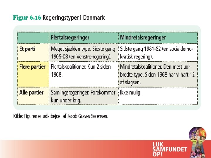 Positiv og negativ parlamentarisme • Positiv parlamentarisme: I lande med positiv parlamentarisme skal det/de partier, der danner regering, fra starten have et flertal i parlamentet bag sig • Negativ parlamentarisme: Det/de partier, der danner regering, kan nøjes med ikke at have et flertal i parlamentet imod sig. • Vi gennemgår tekstboks 6. 3 side 122 i fællesskab