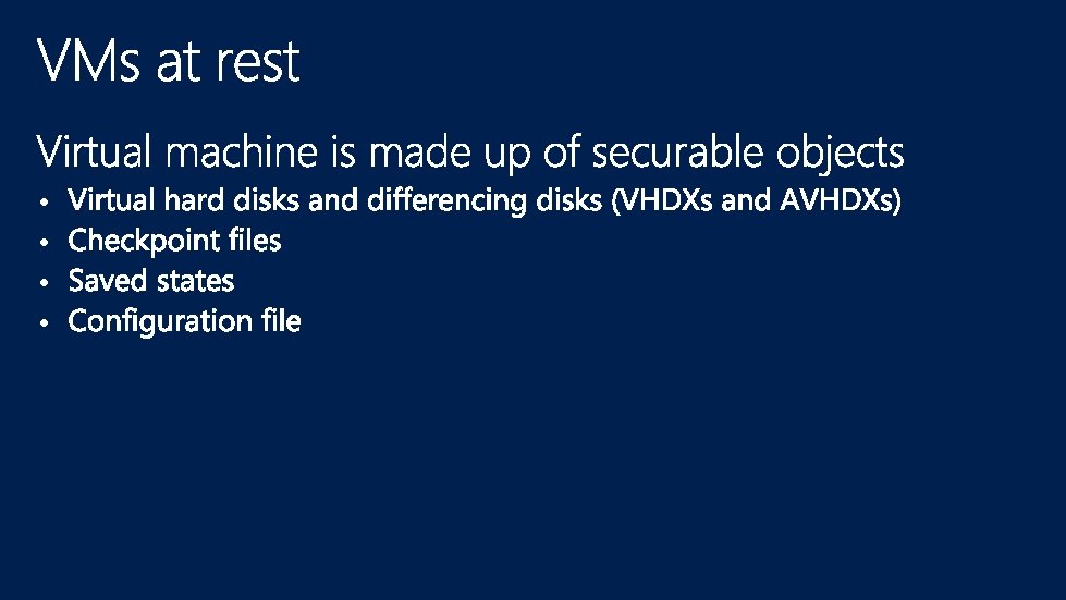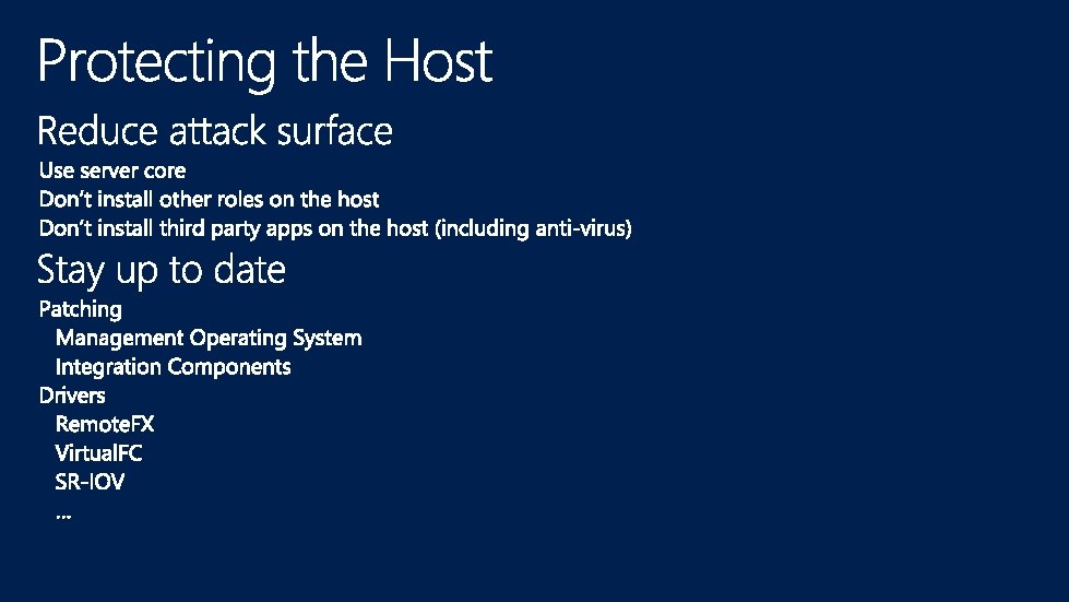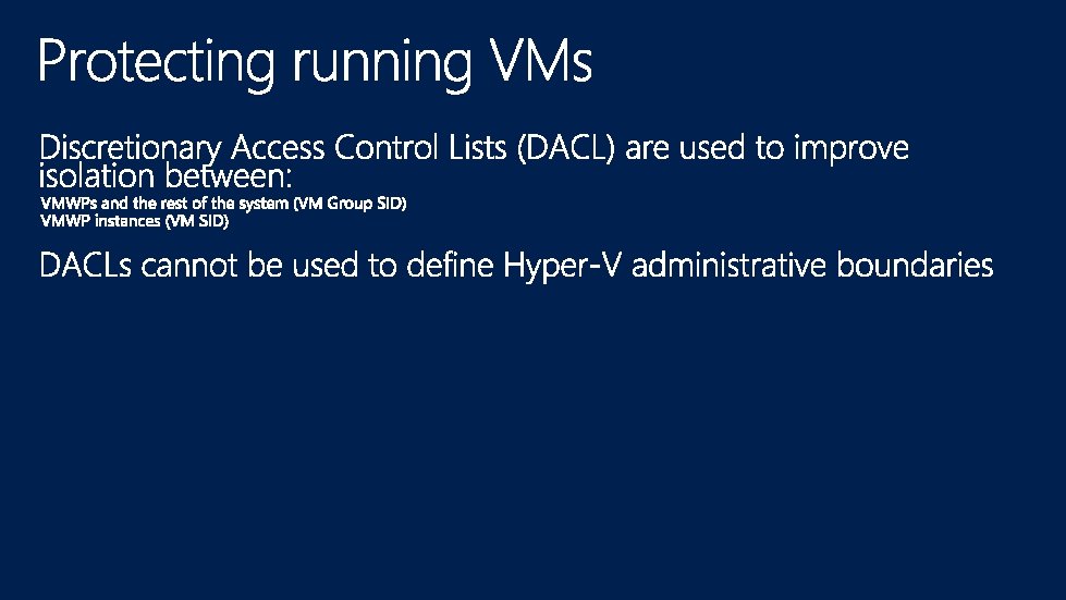 Management OS VM Worker Processes VM Management Service Guest VM 1 Guest VM n User Mode VID Hypervisor Win. Hv Hypercalls … Win. Hv Scheduler Win. Hv Partition Manager Model Specific Registers Hardware Address Manager Interrupt Controller