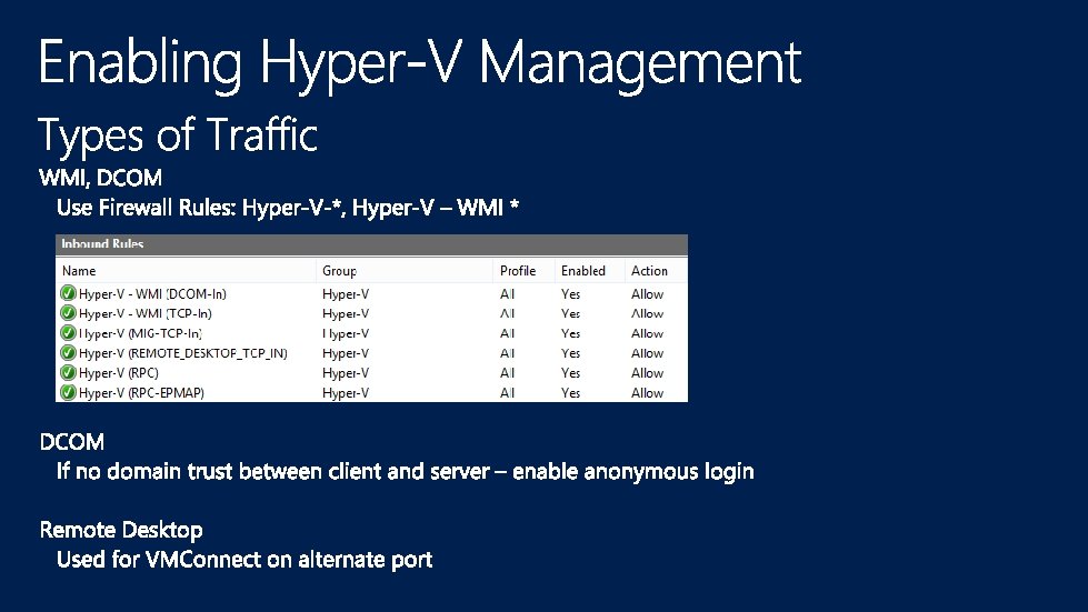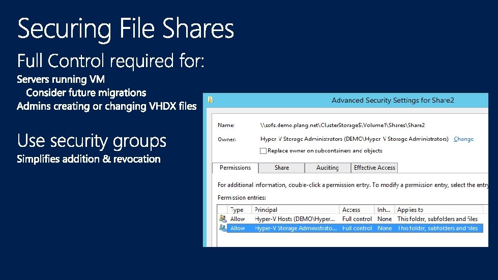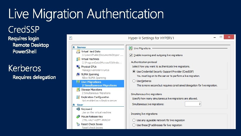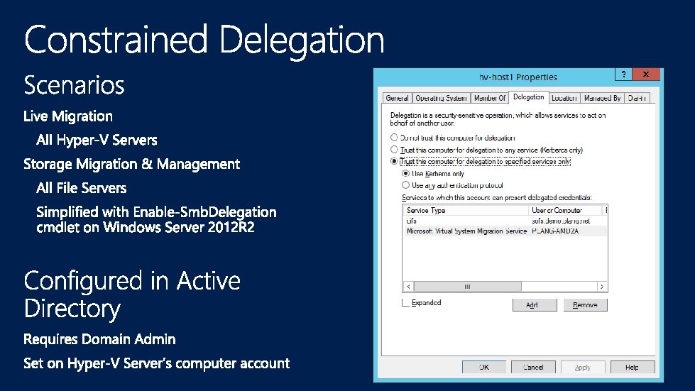 Allows The Hyper-V Server To Retrieve a Proxy Ticket For Any User To Named Resources Enabled On The Hyper-V Server’s Computer Account Requirements • • Windows Server 2012 KDC Active On Front/Back End Domains Computer Account Write Privileges To Configure Helpful Blog Posts Live Migration and Storage Migration Without Constrained Delegation Using Principals. Allowed. To. Delegate. To. Account Remote Administration Without Constrained Delegation Using Principals. Allowed. To. Delegate. To. Account