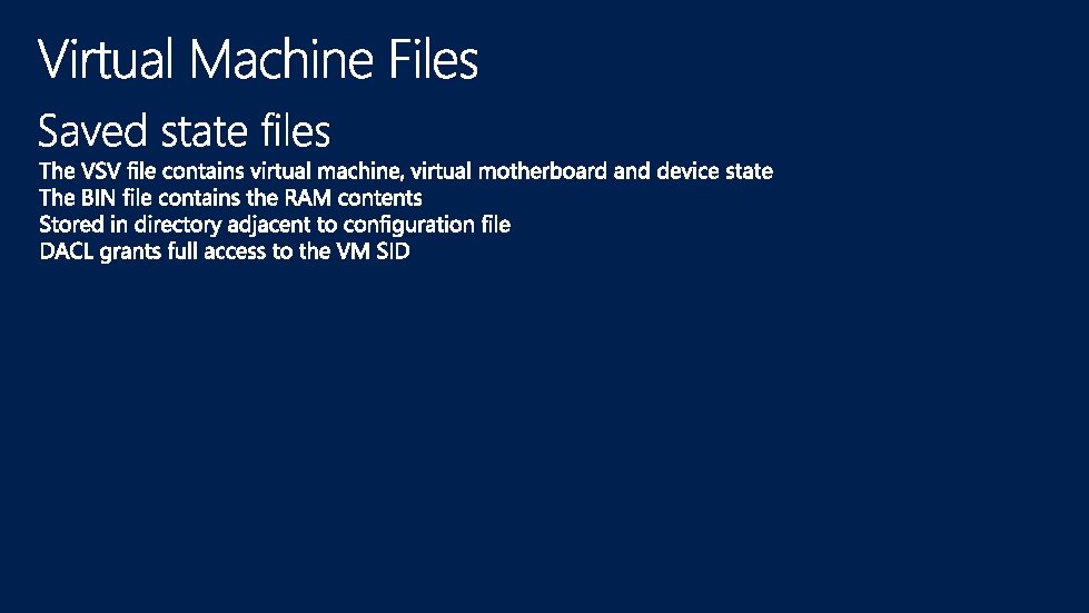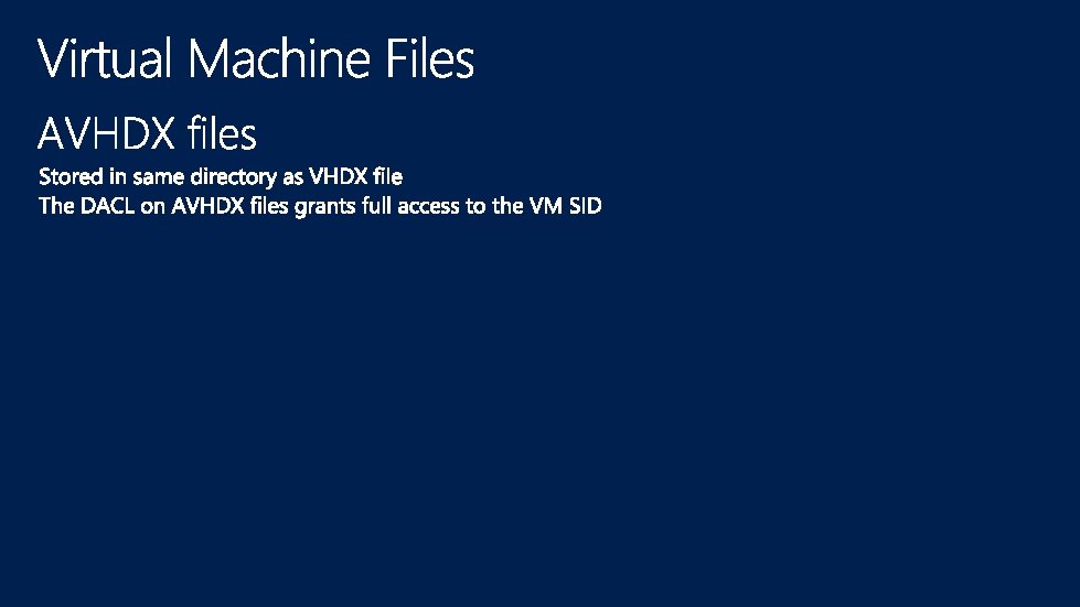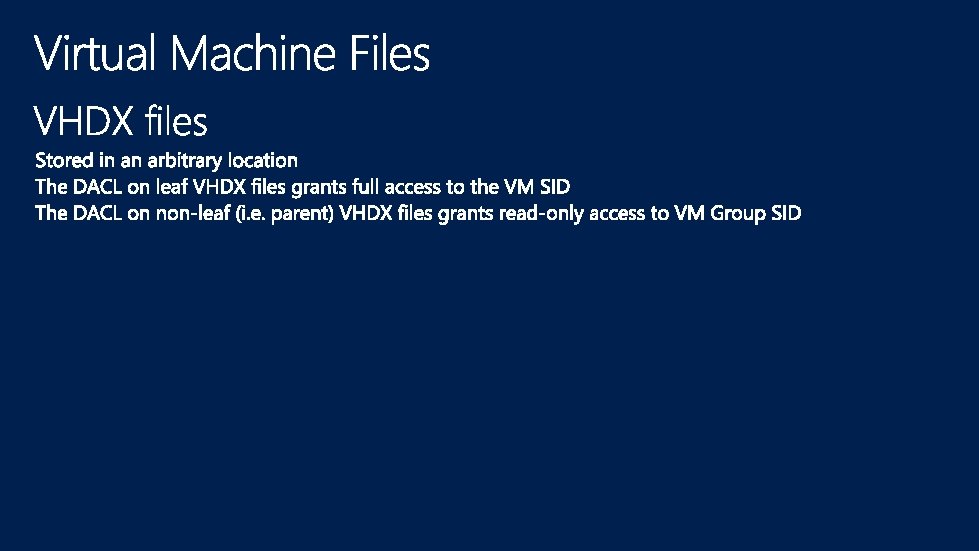 Management OS Guest VM 1 Guest VM n User Mode Virtualization Service Client (VSC) VM Worker Processes VM Management Service VID VSPs Win. Hv I/O stack Win. Hv … Win. Hv drivers Hypervisor VM Bus Hypercalls VM Bus Scheduler VM Bus Partition Manager Model Specific Registers Hardware Address Manager Interrupt Controller