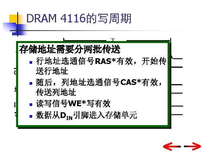 DRAM芯片4116 n n 存储容量为 16 K× 1 16个引脚: n n n 7根地址线A 6~A 0 1根数据输入线DIN 1根数据输出线DOUT 行地址选通RAS* 列地址选通CAS* 读写控制WE* VBB DIN WE* RAS* A 0 A 2 A 1 VDD 1 2 3 4 5 6 7 8 16 15 14 13 12 11 10 9 VSS CAS* DOUT A 6 A 3 A 4 A 5 VCC