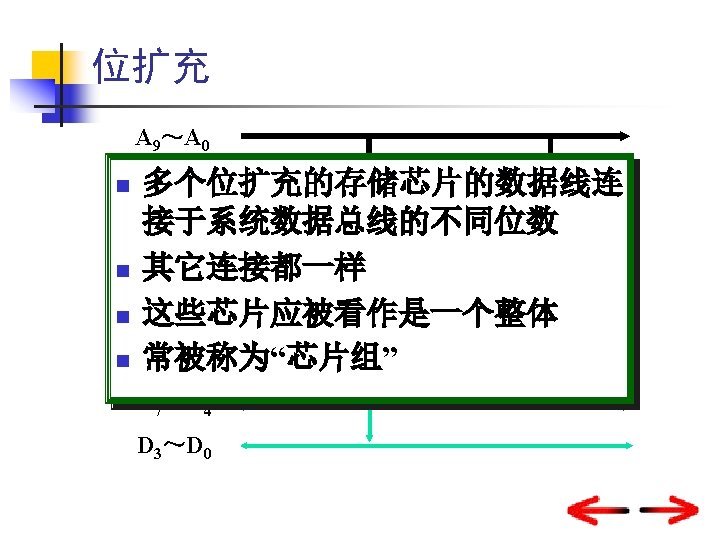 SRAM芯片2114 n n A 6 1 18 Vcc A 5 2 A 7 A 4 3 17 16 A 3 4 15 A 9 A 0 5 14 I/O 1 A 1 6 13 I/O 2 A 2 7 12 I/O 3 CS* 8 11 I/O 4 GND 9 10 WE* 存储容量为 1024× 4 18个引脚: n n 10根地址线A 9~A 0 4根数据线I/O 4~I/O 1 片选CS* 读写WE* 功能 A 8