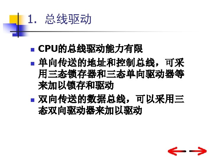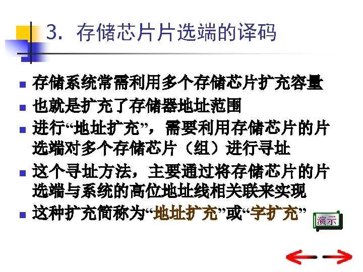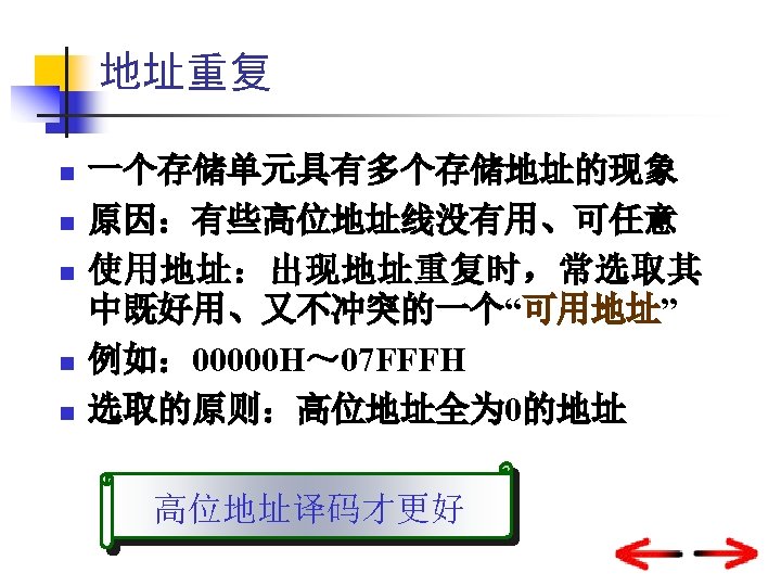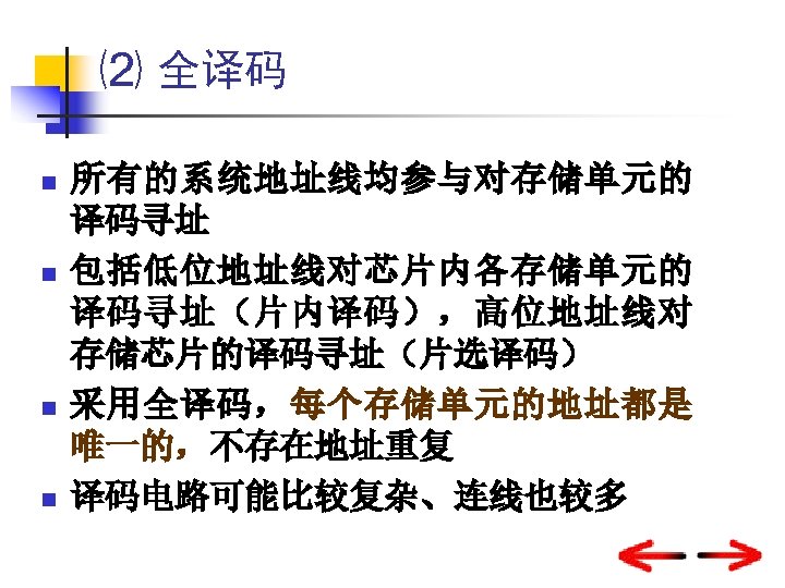 部分译码示例 1 2 3 4 A 17 E 3 Y 0 A 16 A 15 E 2 Y 1 A 12 A 19~ A 14~ A 11~A 0 Y 2 E 1 IO/M ×× 10× 000 全 0~全 1 Y 3 ×× 10× 001 CE全 0~全 1 CE A 14 C ×× 10× 010 全 0~全 1 A 13 2732 B 138 ×× 10× 全 0~全 1 (1) (2) A 12 A 011 A 11~A 0 一个可用地址 20000 H~ 20 FFFH 21000 H~ 21 FFFH CE CE 22000 H~ 22 FFFH 2732 23000 H~ 23 FFFH (3) (4)