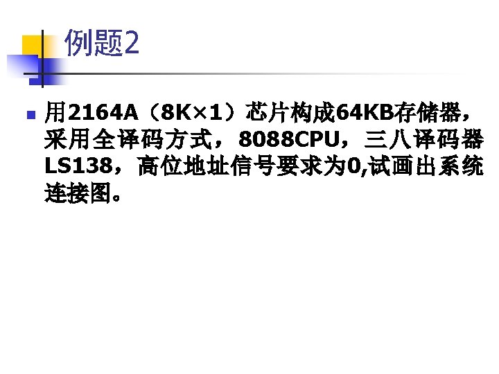 线选译码示例 A 14 1 2 A 19~A A 1315 A 14 A 13 ××××× 1 0 0 1 A 12~A 0 CE 全 0~全 1 2764 全 0~全 1 (1) 一个可用地址 CE 04000 H~ 05 FFFH 2764 02000 H~ 03 FFFH (2) A 12~A 0 切记: A 14 A 13= 00的情况不能出现 00000 H~ 01 FFFH的地址不可使用