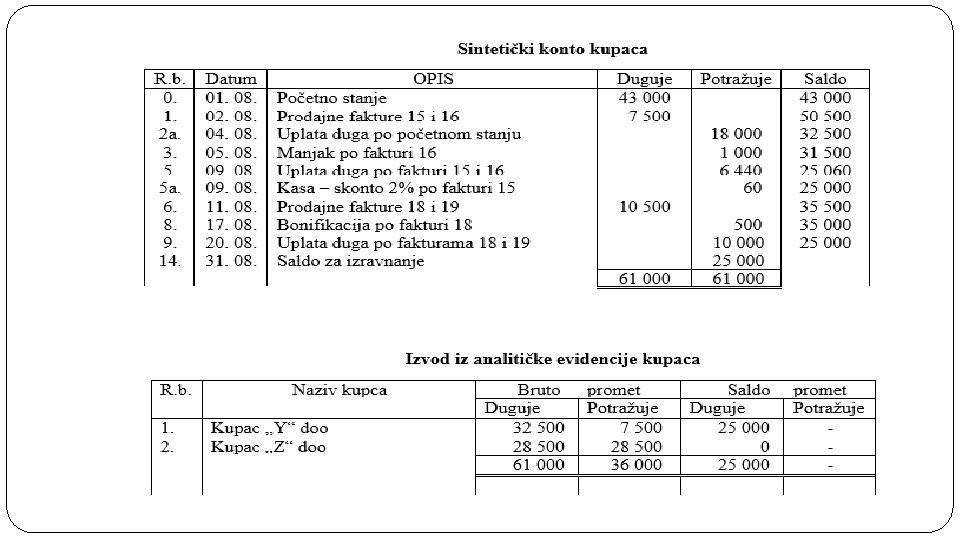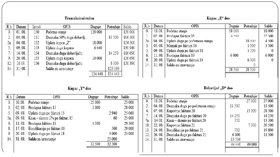 Primjer uporedne evidencije na kontima transakcioni račun, kupci i dobavljači Privredno društvo „X“ doo, koje na dan 01. 08. na transakcionom računu ima 120 000 €, posluje sa kupcima „Y“ doo čije je početno stanje 25 000 € i „Z“ doo čije je početno stanje 18 000 €, i sa dobavljačem „D“ doo kod koga je početno stanje 27 000 €. Objašnjenje: Transakcioni račun je aktivan konto, pa se iznos od 120 000 € knjiži na strani duguje. Takođe i kupac je aktivan konto, pa se iznosi od 25 000 € knjiži na dugovnoj strani na konto kupca „Y“ doo, a na konto kupac „Z“ doo iznos od 18 000 €. Dobavljač je pasivan konto, pa se iznos od 27 000 € knjiži na strani potražuje na kontu dobavljač „D“ doo. 1. promjena - 02. 08. Po prodajnoj fakturi 15 i otpremnici 13 prodato je robe kupcu „Y“ doo u vrijednosti od 3 000 € i po prodajnoj fakturi 16 i otpremnici 14 kupcu „Z“ doo robe u vrijednosti od 4 500 €. Kupcu „Y“ doo se odobrava 2% kasa – skonta ako fakturu 15 plati u roku od 9 dana. Objašnjenje: Prodajom robe se povećava potraživanje prema kupcu, pa se iznos od 3 000 € knjiži na strani duguje na kontu kupac „Y“ doo, odnosno 4 500 € na strani duguje na kontu kupac „Z“ doo. Kasa – skonto je samo informacija do momenta izmirenja duga u ugovorenom roku.