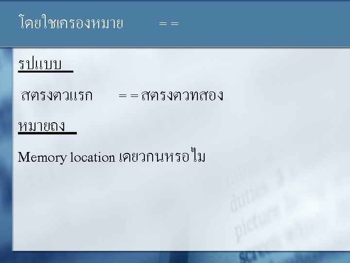 ขอแตกตาง กรณทใชคำสง new ภาษาจาวาจะสรางขอความใหมและจองเนอทในหนวยความจ String s 1= new String(“wathinee”); ำเสมอ String s 2= new String(“wathinee”); String s 3= new String(“Wathinee”); Wathinee wathinee s 3 s 2 s 1 Oxoaaa Oxooee Oxdefe Stack wathinee Heap