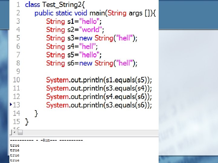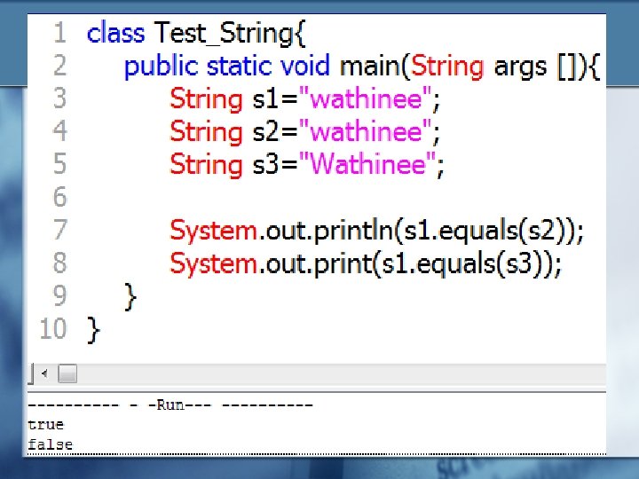 String s 1=“hello”; String s 2=“world”; String s 3=new String(“hell”); String s 4=“hell”; String s 5=“hello”; String s 6=new String(“hell”); คำถาม s 1 == s 5 s 3 == s 4 == s 6 s 3 == s 6 s 1. equals(s 5) s 3. equals(s 4) s 4. equals(s 6) s 3. equals(s 6)