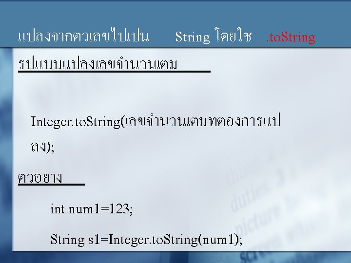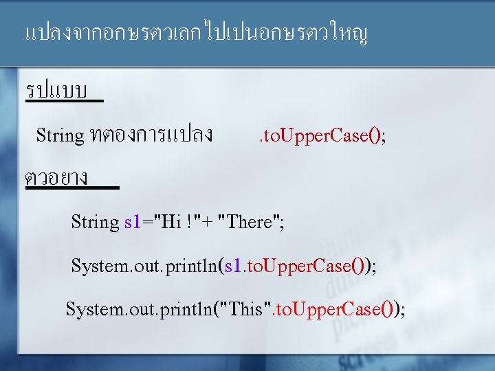String เปน Object ทมตวดำเนนการในการเชอมขอความ String s 1=“Hi !”+ “There”; System. out. print(s 1); String s 2=“This”; String s 3=s 2+ “is a book”; System. out. print(s 3); String s 4=s 2+4; System. out. print(s 4); ภาษาจะแปลงขอมลดงกลาวใหเปน String โดย