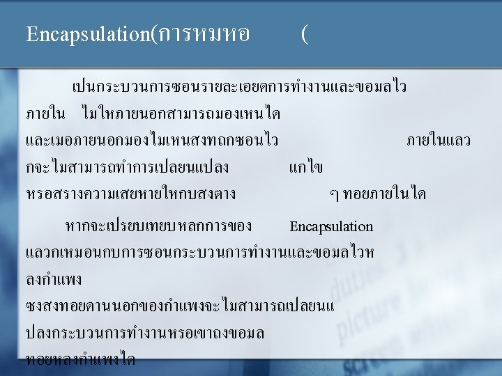 รจกกบ คำตอไปนทเกยวของกบ Encapsulation n Access modifier n private, n public, n protected n package (none หรอ default)