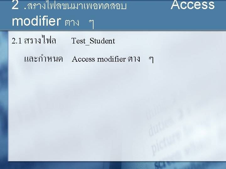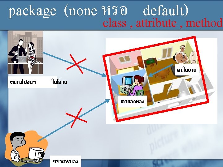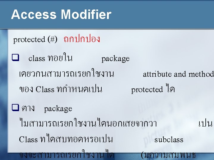 Access modifier เพอกำหนดระดบการเขาใชงานได แก q private, q package (none หรอ default) q protected q public